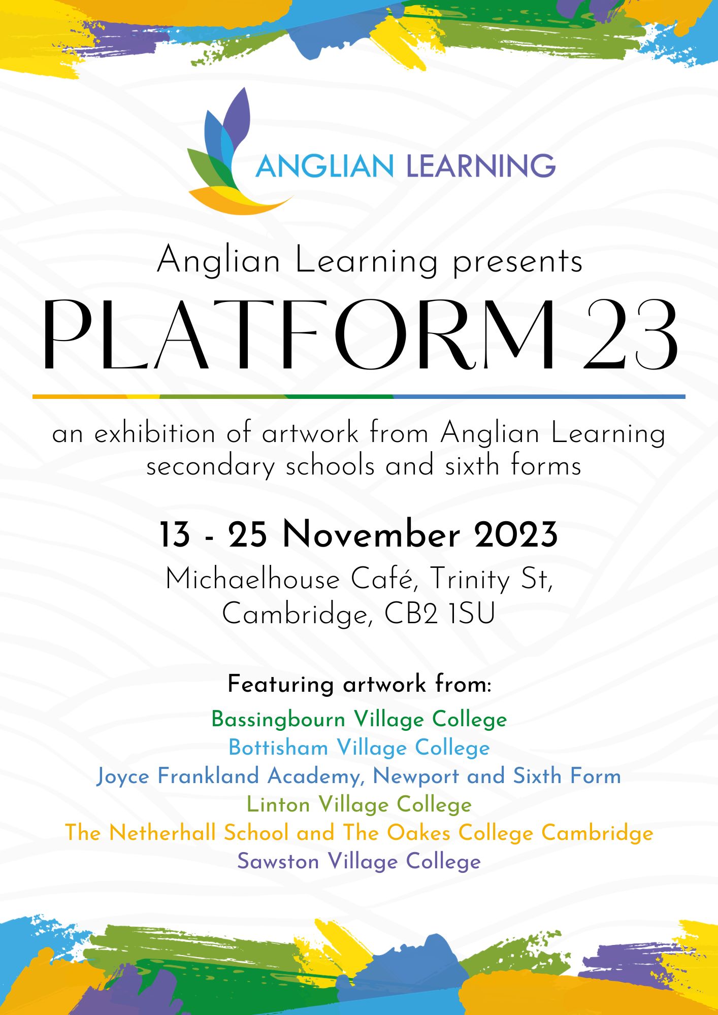 On display is a range of over 30 pieces, illustrating talent from year 7 through to sixth form students from Bassingbourn, Bottisham, Linton and Sawston Village Colleges, The Netherhall School and The Oakes College, Cambridge, as well as Joyce Frankland Academy, Newport and sixth form.