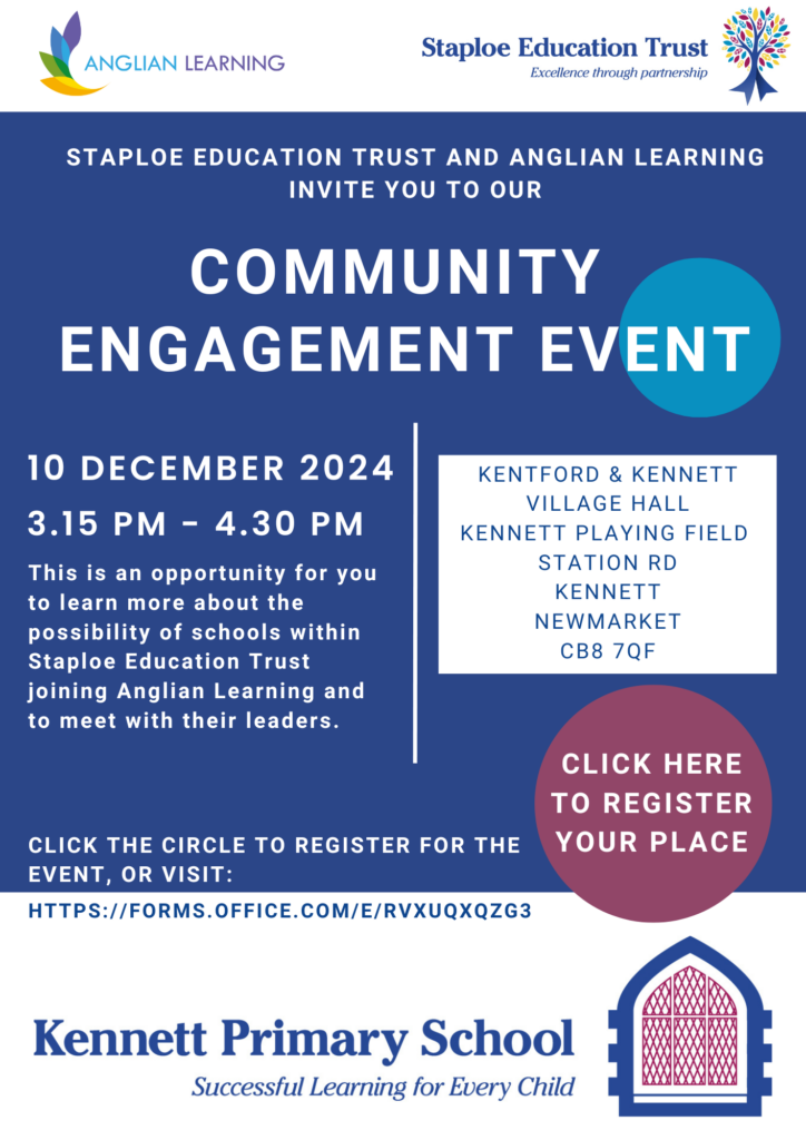 Please see the below details for Kennett Primary School’s event on Tuesday 10 December from 3.15 pm to 4.30 pm at Kentford and Kennett Village Hall.