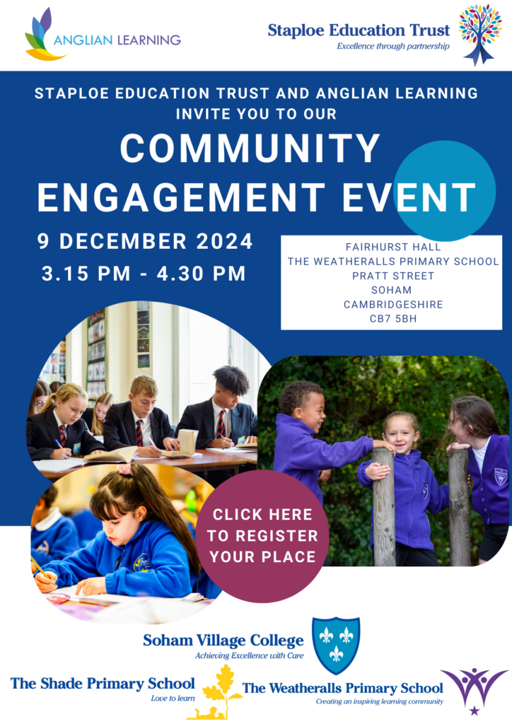 You are invited to our engagement events which are an opportunity to learn more about the possibility of Staploe Education Trust’s schools, Soham Village College, The Shade Primary School, The Weatheralls Primary School and Kennett Primary School, joining Anglian Learning. Both events provide an opportunity for you to meet with Anglian Learning’s leaders and ask any questions that you may have.